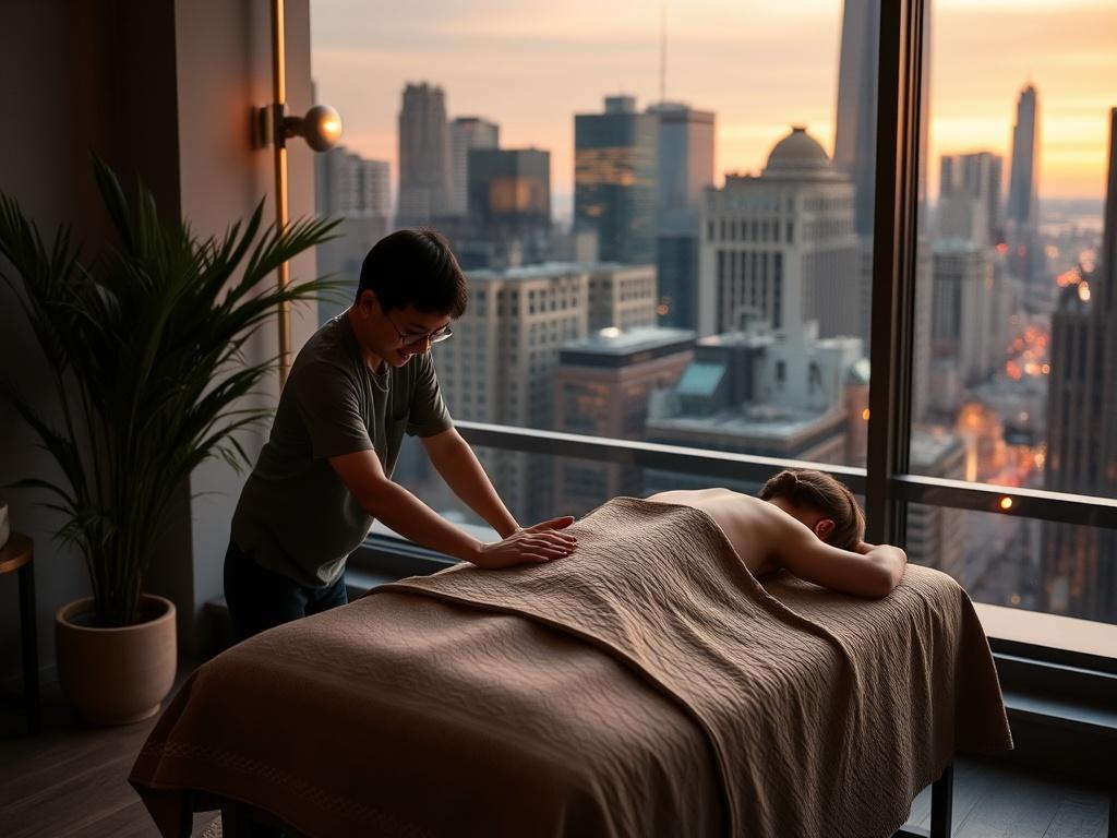 For visuals that suit a tasteful article or social posts: opt for high-quality photos of licensed massage therapists in professional spa settings, serene close-ups of hands working on shoulders, and nighttime Manhattan skyline shots — rooftop perspectives, Times Square from a distance, or the Brooklyn Bridge at dusk. Avoid sexualized imagery; choose elegance and atmosphere.